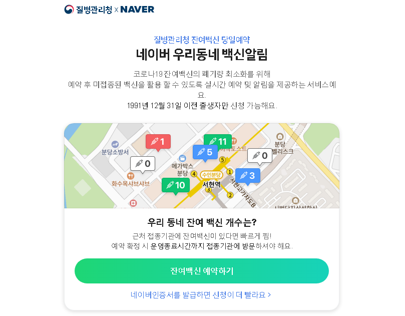 네이버는 웹, 앱, 지도앱을 통해서 '잔여 백신'을 검색하면 잔여 백신 수량이 나오고 예약이 가능합니다.